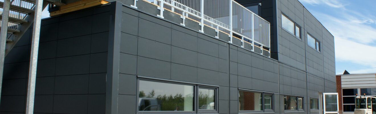 Udvendigt er bygningen beklædt med antracitgrå cementfiber og tagpap, og indvendigt er vægge, lofter og gulve udført af sunde højkvalitetsmaterialer, for at give et godt og rart indeklima. Lofterne er desuden beklædt med træbeton, for at give optimal akustik. Bygningen leveres monteret med EDB- og elinstallationer.