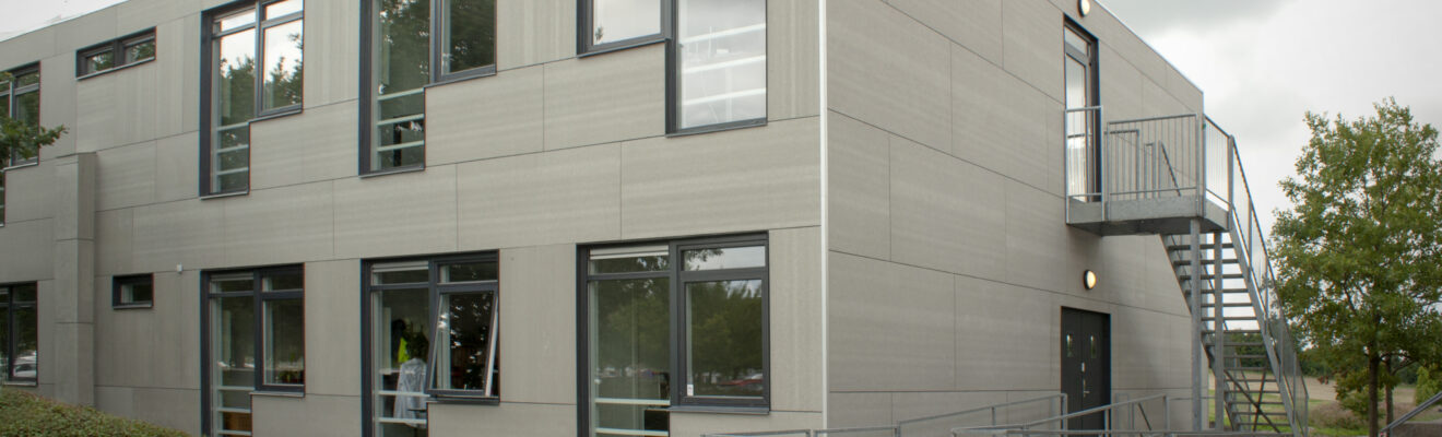 Udvendigt fremstår bygningen med et stilrent og moderne udtryk. Facaden er beklædt med grå cembrit facadebeklædning kombineret med sort paptag, hvilket giver et industrielt og råt, men samtidig roligt og tidløst udseende. På den ene gavl er der etableret en rampe, som sikrer nem og lige adgang for kørestolsbrugere og gangbesværede og understøtter bygningens tilgængelighed i hverdagen.